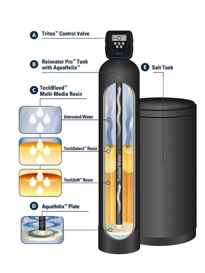 - When the TechBlend™ resin is ready to be cleaned and recharged, the system uses a brine (sodium or potassium) solution in concert with the AquaHelix™ plate to efficiently lift and clean the resin while providing significant salt and water savings due to its revolutionary design.